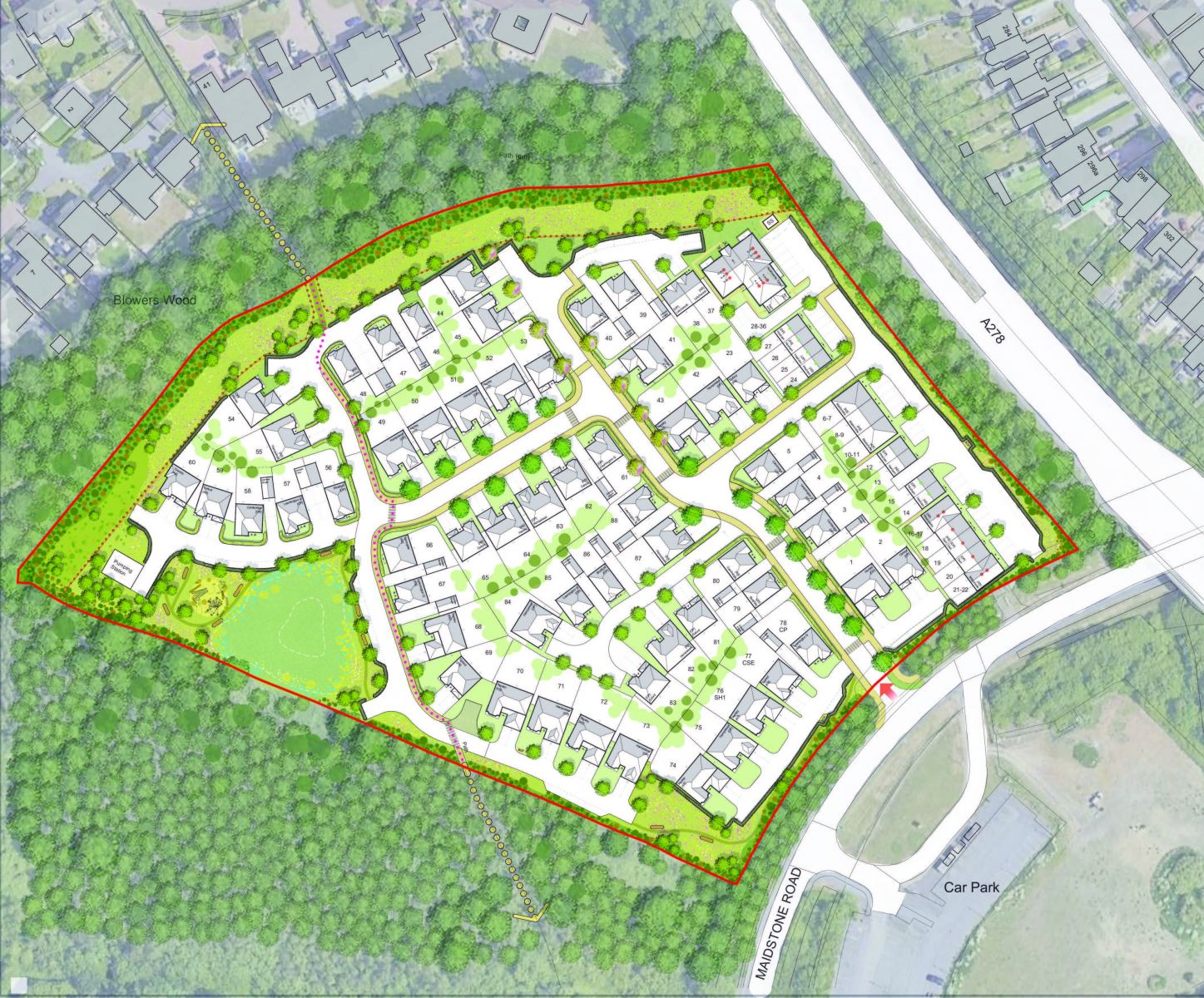 The houses which face the A278 have been designed to screen the rest of the development and garden areas from road noise.