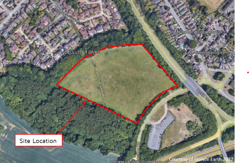 The site is a parcel of land of just under 4 hectares in size. It is enclosed by Blowers Wood and Chapel Hill Wood to the west and south and by Hoath Way and Maidstone Road to the north and east. There is a single existing vehicular access from Maidstone Road.